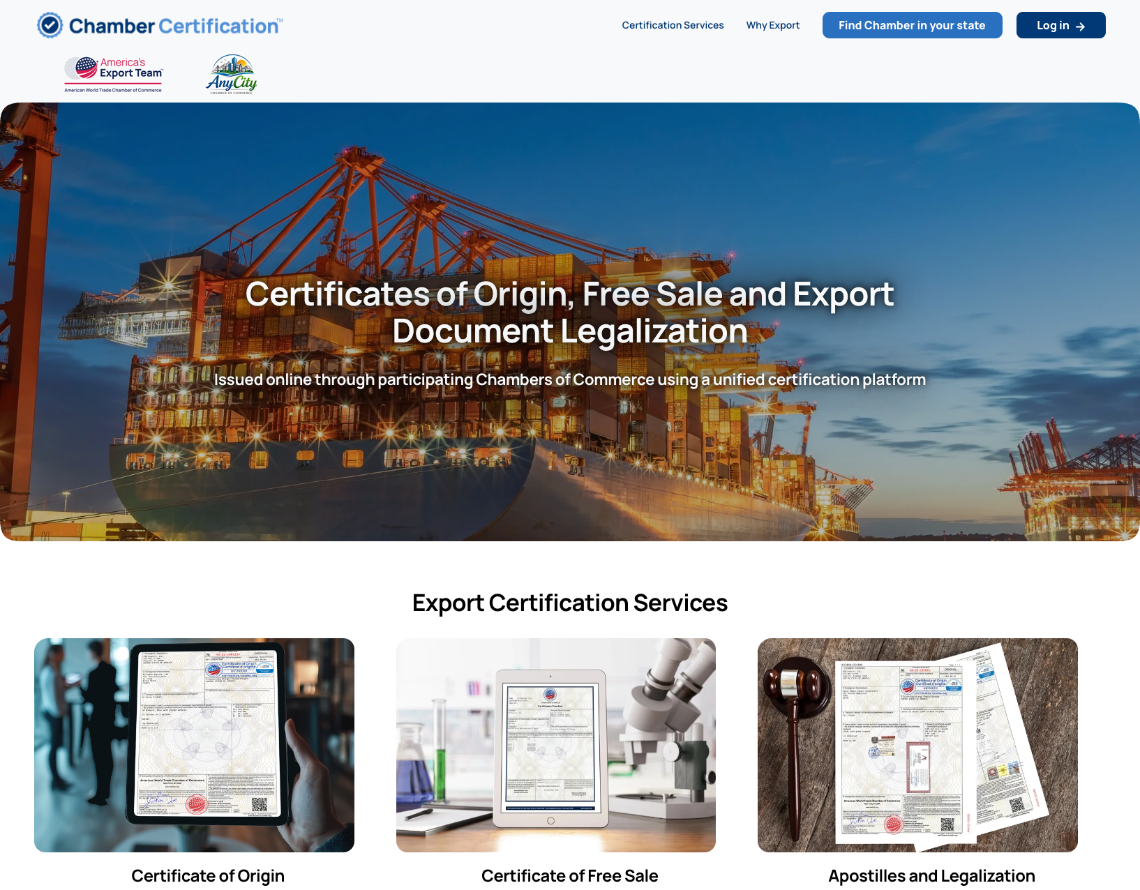 Exporters access certification services through your Chamber’s branded portal.